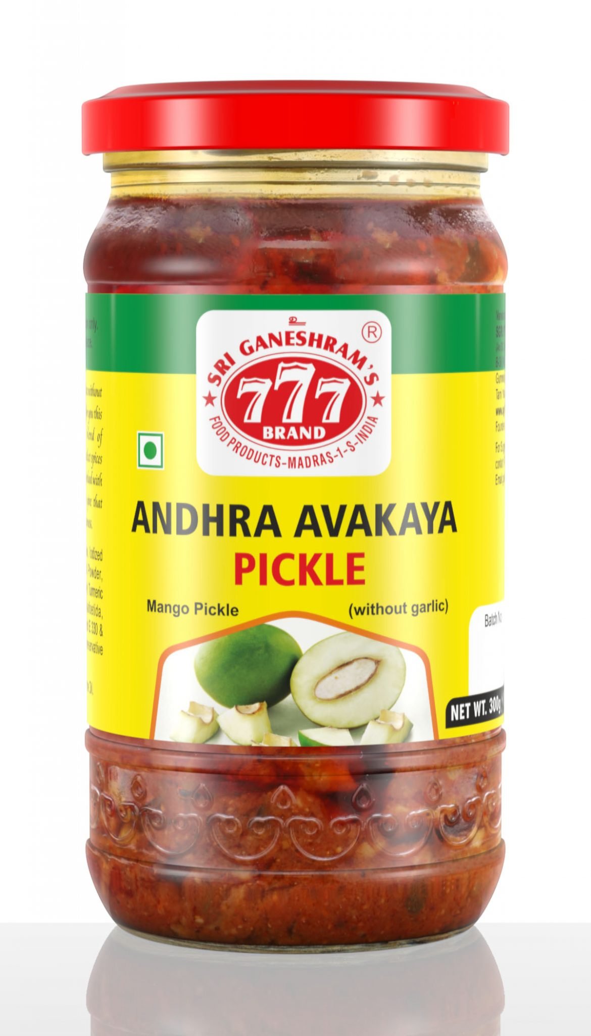 Typical Hot n Spicy South Indian (Andhra) Pickle made using Fresh Green Raw Mangoes cut along with shell and pickled using salt and other spices blended and seasoned with Mustard and pure gingelly oil. Tastes very good with 777 Dhall Powder Rice and Curd Rice.