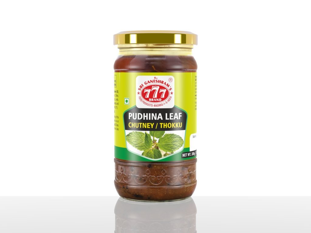 Typical South Indian Chutney made using Fresh Green Pudhina (mint) leaves nicely ground into paste and pickled using salt and other spices blended and seasoned with mustard and sesame oil.