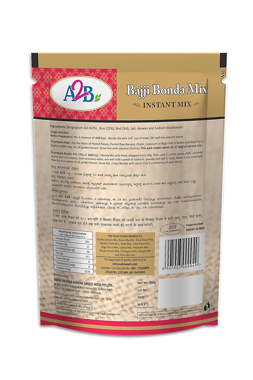 This Is A Vegetarian Product.Bajji Bonda Mix Powder – A Delicious Traditional Snack. Ready In An Instant. It Can Be Rightly Described As An ‘Exclusive Health Food’A2B Bajji & Bonda Mix: One Mix For Multiple Sides Like Bonda, Potato Bonda, Vazhakkai(Raw Banana) / Potato/ Onion/ Potato Bajji, Onione Pakoda,Finest Spices & Rich Quality Gram Flour Are Used To Prepare This Instant Mix.Specifications, Color & Contents May Vary From Illustration