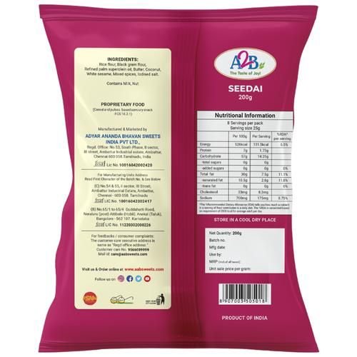 A2B Seedai makes for the best side for drinks and hot beverages. The A2B Seedai is made with Rice Flour, Roasted Urad Dal Flour, Cumin and other desi ingredients. In the case of a gluten-free diet, rice flour can be a healthy replacement for wheat. Calcium and phosphorus, two nutrients that support the health of bones and teeth, are abundant in urad dal. Magnesium and potassium are beneficial for improving digestion, immunity, and heart health. Urad dal is a fantastic addition to a weight reduction diet because it is also quite high in protein and fibre, both of which help boost energy levels. Explore a wide range of savoury and sweet snacks from A2B only on Big Basket.
